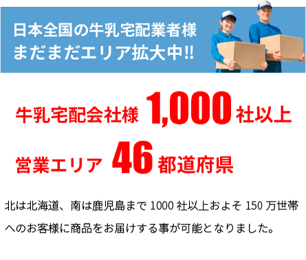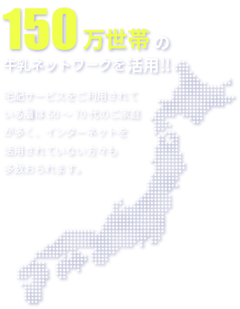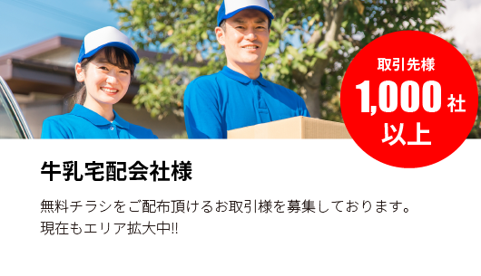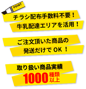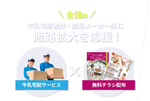弊社は地域密着型のため全国に点在している牛乳宅配会社様に無料チラシを配布頂く事で、今までにない販路からのアプローチが可能です。